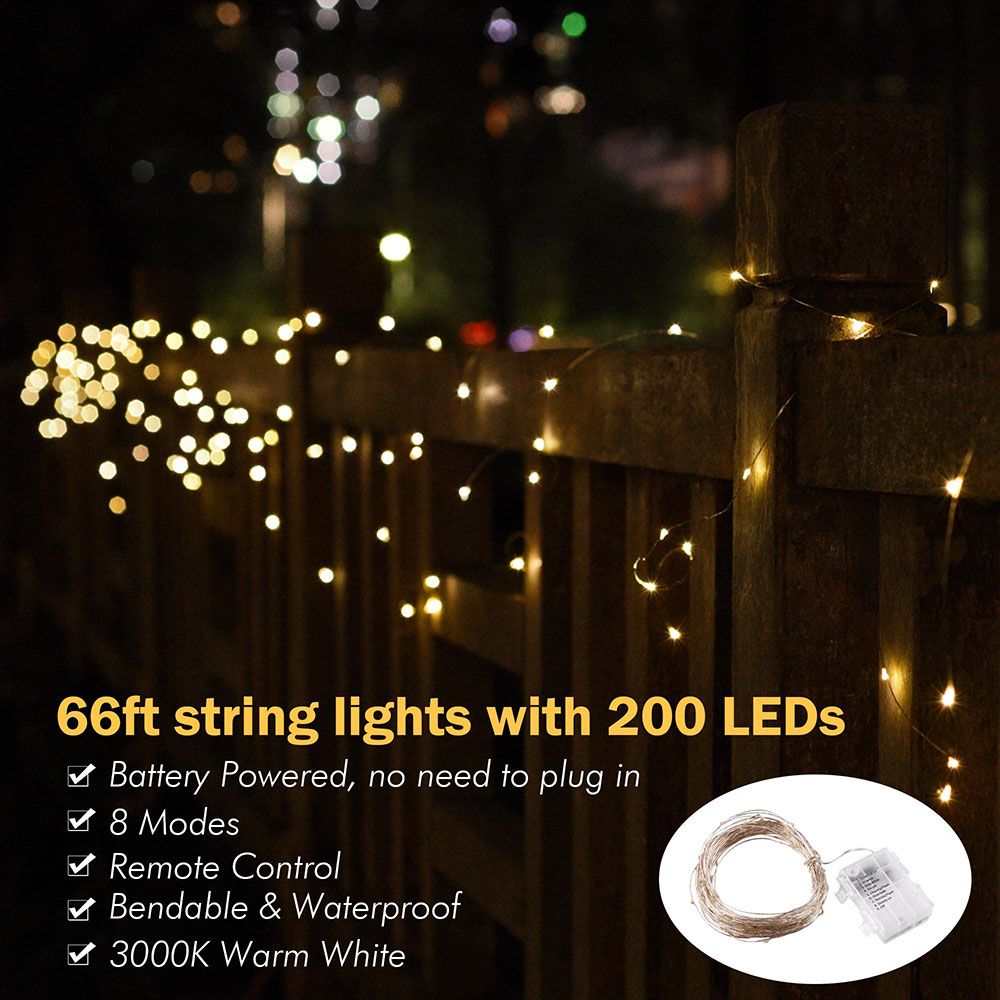 - Festival Decoration - DELight 66ft Fairy Light String with 200pcs LED beads features battery-powered design without the need to plug in, and a remote controller for setting and adjusting time, brightness and modes, allowing for convenient usage as both an indoor or outdoor decorative feature