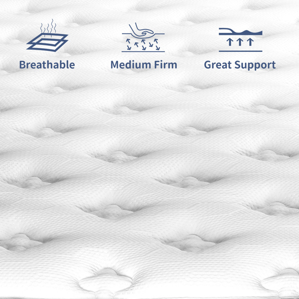 This medium firm hybrid mattress offers an ideal balance of support and comfort. Built with individually pocketed coils and multiple layers of foam, it contours to your body, relieves pressure points, and reduces motion transfer for a more restful sleep. Reinforced edge support enhances overall stability and helps keep your body comfortably centered throughout the night.Compressed and shipped in a convenient box, the mattress expands easily after unboxing and is compatible with most standard bed frames. Whether sleeping alone or with a partner, it delivers a quiet, supportive, and refreshing sleep experience.Built with a hybrid structure, this mattress features memory foam for pressure relief and contouring comfort; pocketed coils provide stable support and minimize motion transfer for undisturbed sleep; reinforced edges offer added stability and usable space near the perimeter; convoluted foam enhances airflow and helps maintain a quieter, cooler sleep surface; conveniently roll-packed for easy delivery and quick expansion, compatible with most bed frames.14" Full hybrid mattress · Medium firm feel · Memory foam + convoluted foam comfort layers · Pocketed coil support · Reinforced edge for added stability · Breathable knitted cover · Compatible with platform, slatted (≤5"), and box spring frames · Roll-packed in a box for easy delivery · 180-night trial + long-term warranty.What's in the Box • 1 × Hybrid Mattress (compressed and roll-packed) • Instruction Guide (optional) • Delivered in a compact box for easy setupCompatible with platform beds, slatted bases (≤5'), and box springs; suitable for all sleep positions and most standard US bed frames.