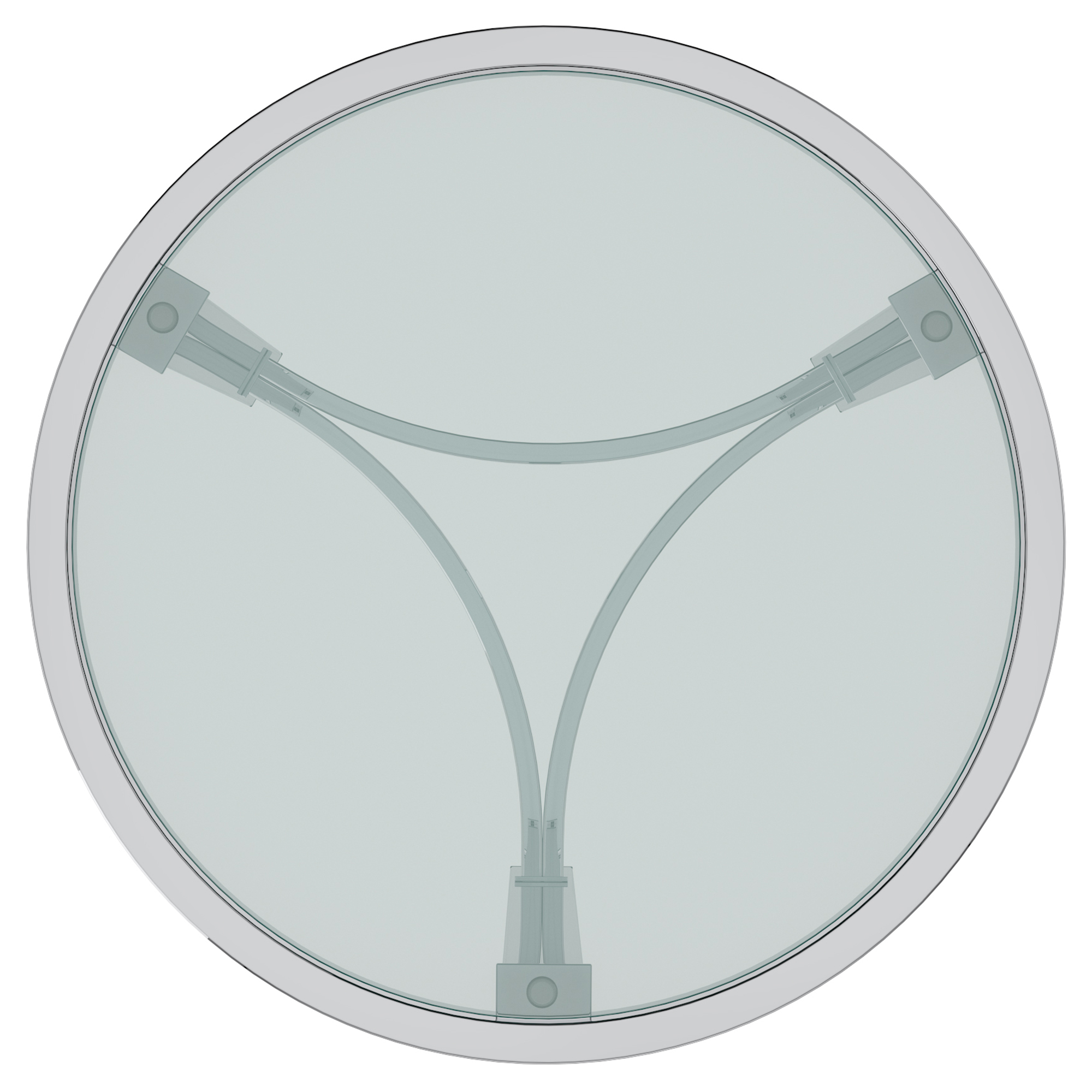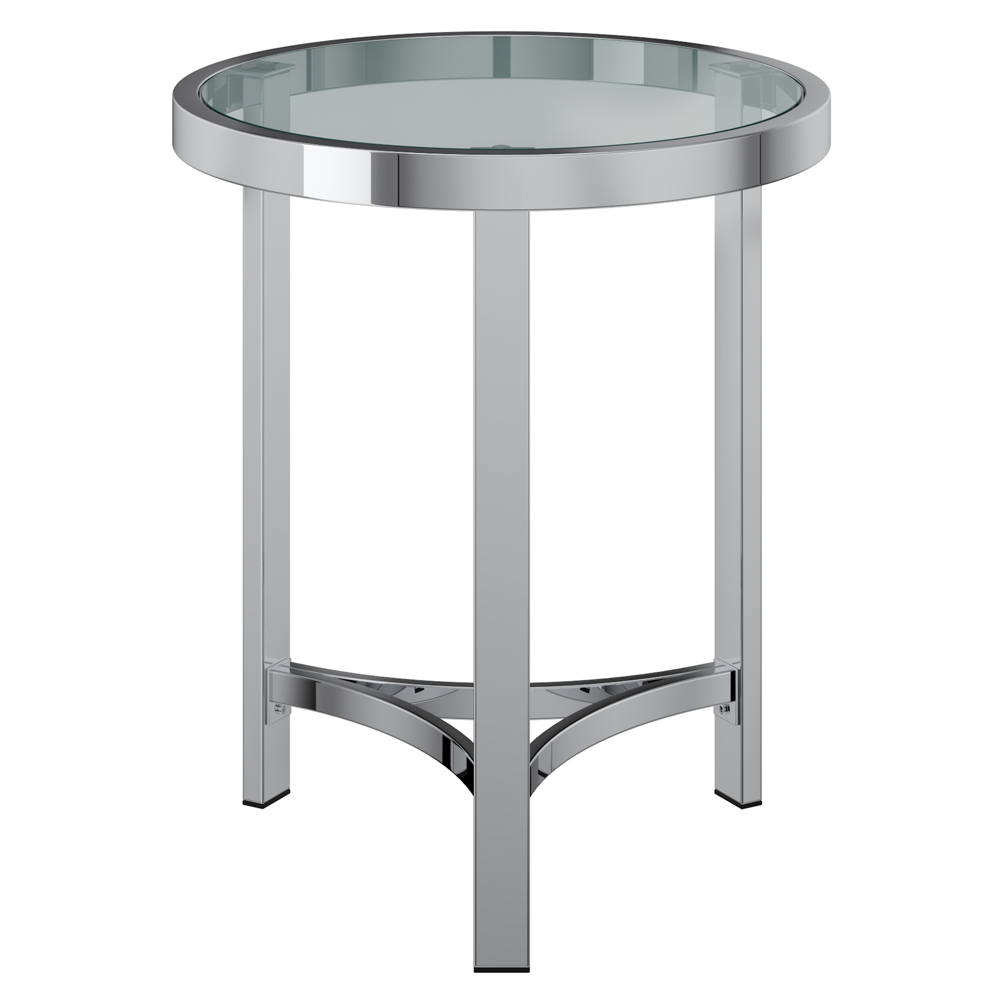 Stylish round chrome-finished table. Sturdy, thick frame has beautifully overlapping curved stretchers. Tempered clear glass is a classy compliment to the chrome. The airy feel of this table is perfect for a casual or formal space. Pair this with the matching coffee table or try placing it in a hallway or bedside.