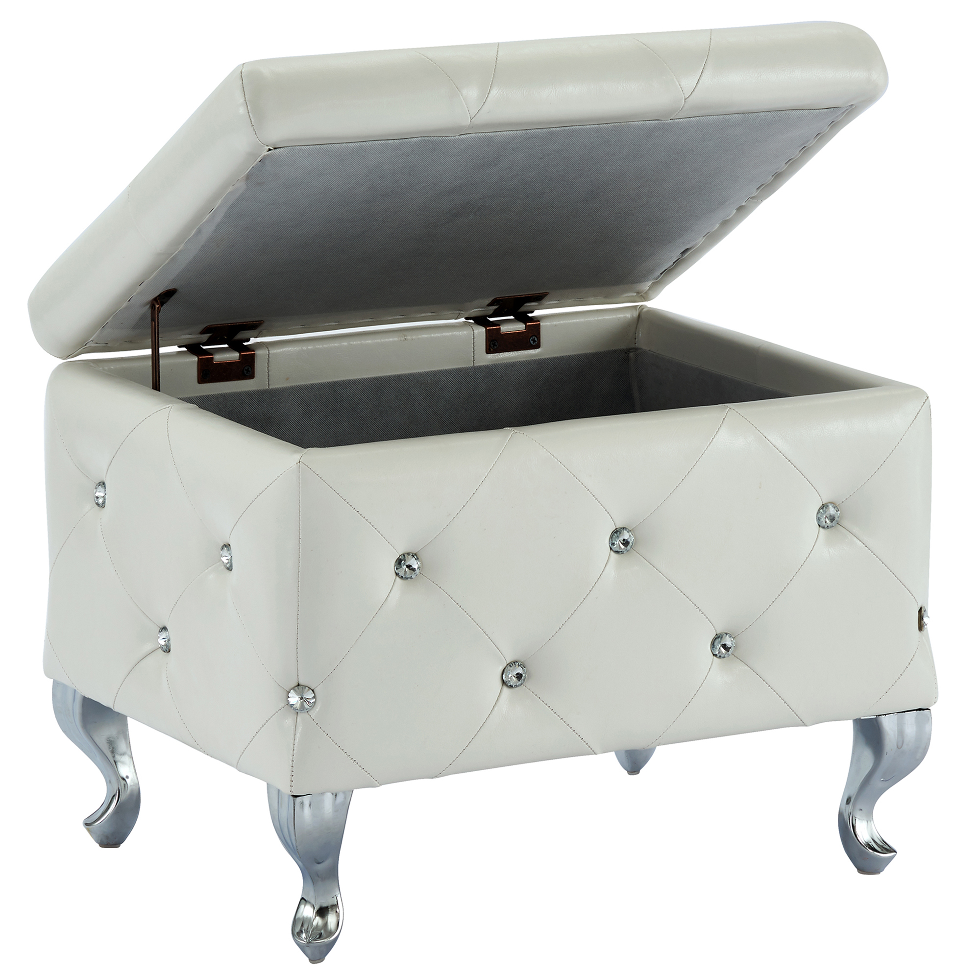 A storage ottoman can be a lavish touch to any home décor ensemble, but this ottoman is truly a one of a kind statement piece. With faux leather upholstery, a beautiful diamond patterned stitching detail, and sparkling crystal button tufting, you'll think this piece came straight off of a fashion runway. Add to it the cabriole style legs with a chrome finish and this ottoman is sure to dazzle from any angle. Attention to detail is in all of the finishes as it includes a deep multi-purpose storage compartment and safety stop hinges to ensure that closing this ottoman will feel as soft and luxurious as it looks. Whether using it for storage or plush seating, this ottoman is sure to turn any ordinary room into something palatial. Perfect for near the door to add some bling to your entryway. Or place a clear tray on top and use as an elegant accent table.