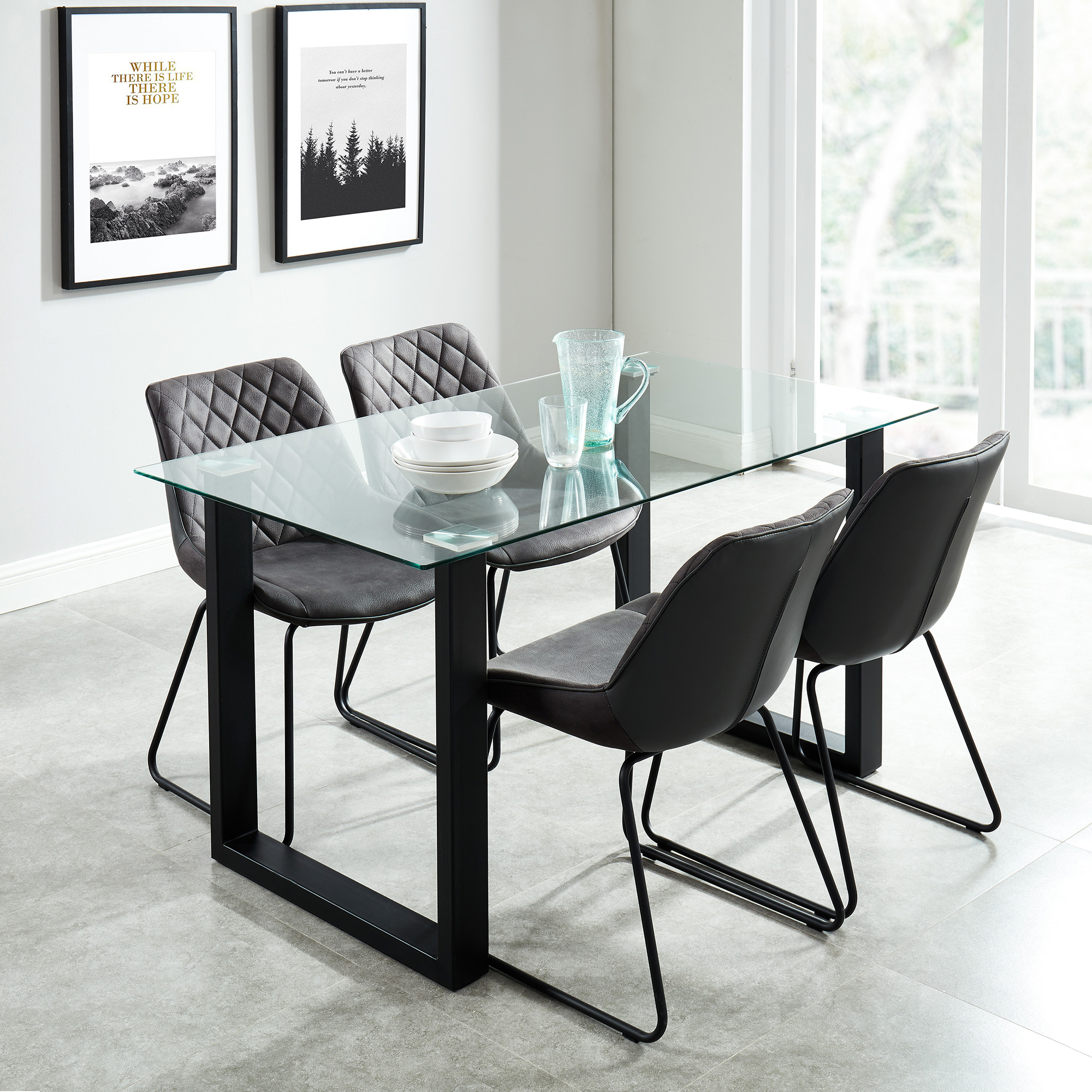 The clean-line design and clear tempered glass gives this table a modern, minimalist look that's punctuated with the sleek black frame. Large enough for four chairs to fit comfortably, yet small enough to work in the tightest spaces. Or scrap the dining idea and use as a fun, contemporary desk. Minimal assembly is required. Mix and match with a variety of chair styles and colours to create the desired effect.