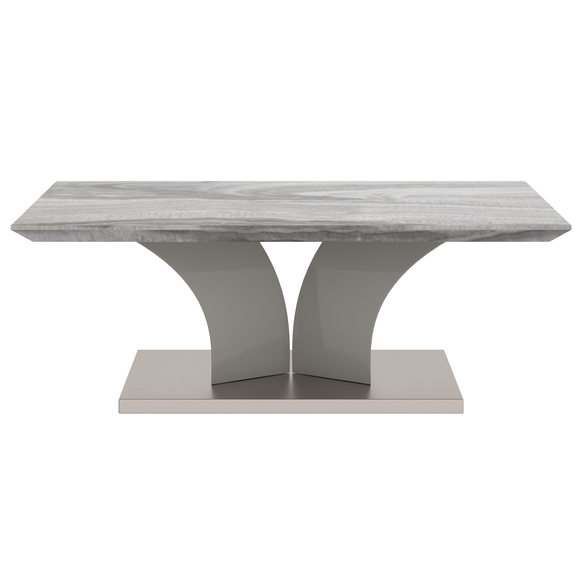 Embrace the classic look of marble and make it modern with this fun coffee table. All the finishings - from the marble-look laminated veneer to the stainless steel wrap on the base - give this piece a high end look without breaking your budget. The fun, geometric base provides plenty of visual interest and the warm grey finish allows for any easy mix with any colour scheme. Great for formal or casual living spaces.