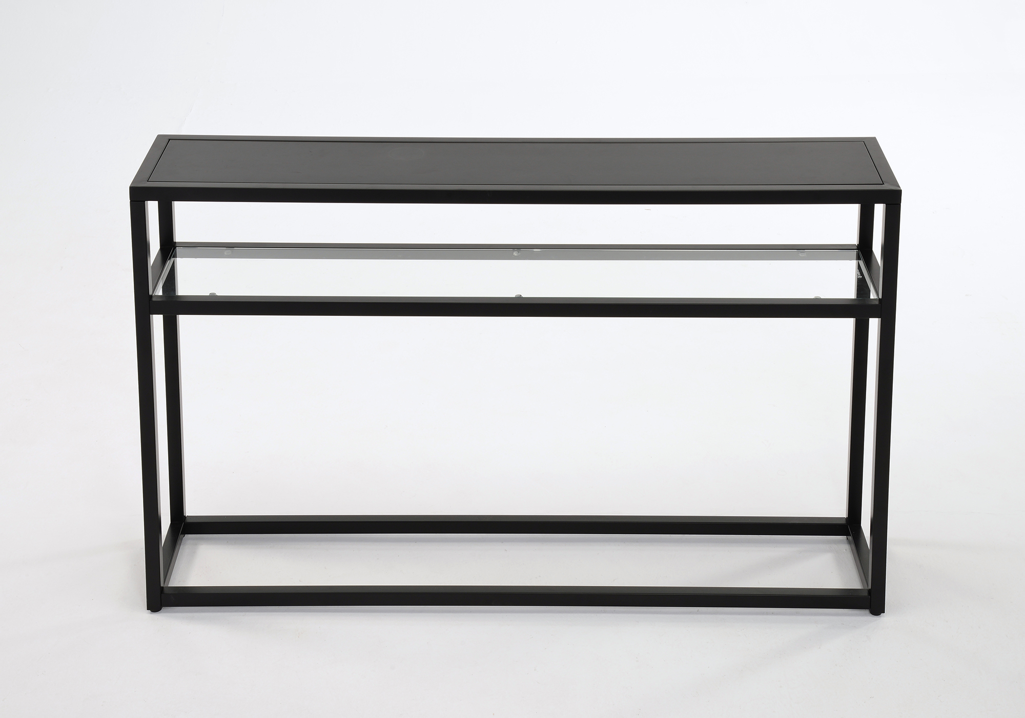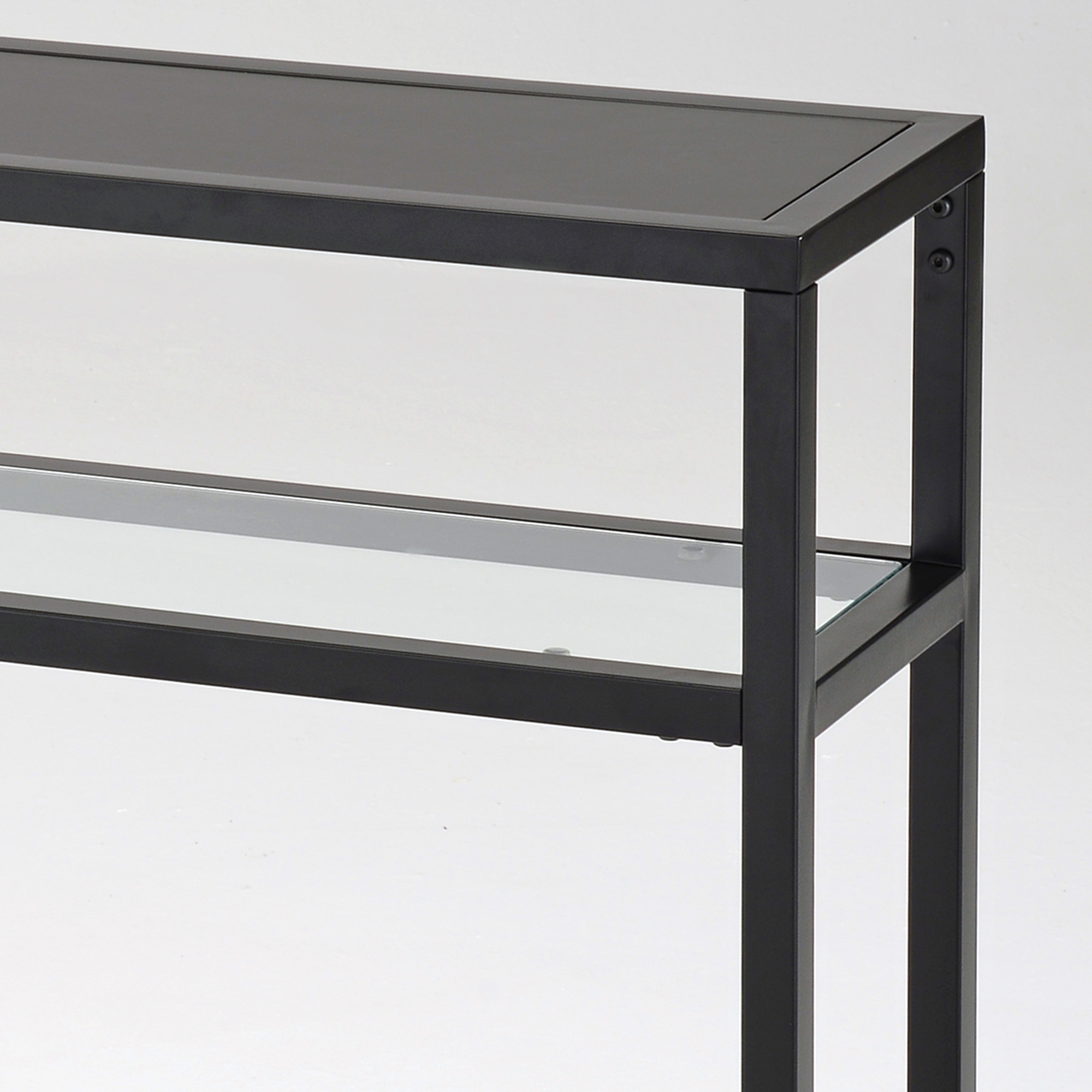 Beautiful contemporary console table - the clean line design will elevate the design factor of any room. The all black finishing - from the engineered wood top shelf to the square metal frame - is accented perfectly with the clear glass second shelf. The narrow depth of this table make it perfect for tighter hallways or entryways.