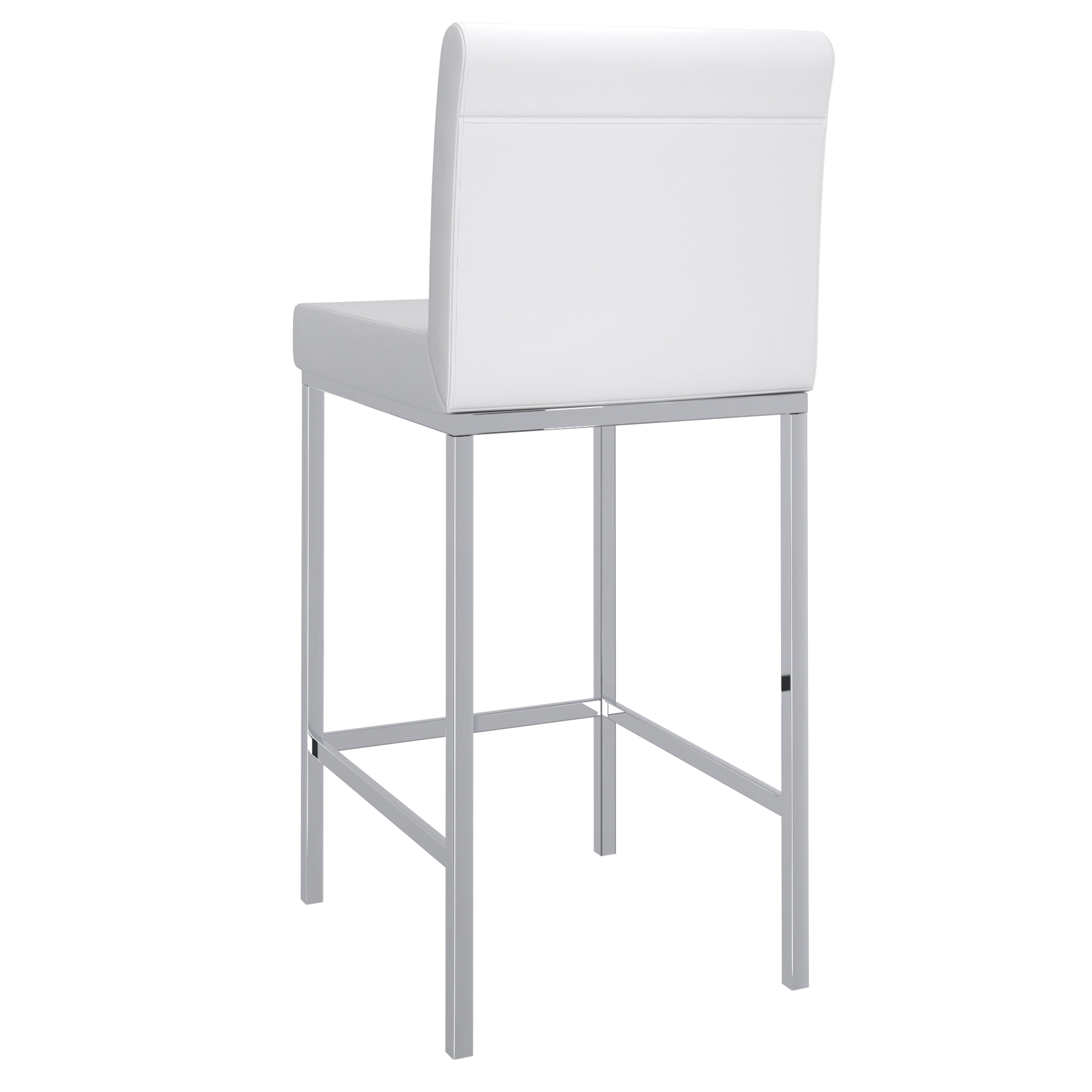 Contemporary counter height stool with faux leather and shiny chrome finishing. Combined, these two materials create a modern piece that will work will with any decor. The low back provides ample back support while adding to the minimalist appeal. Great for a casual breakfast bar or for the fancy basement bar where you can spend hours conversing with guests.