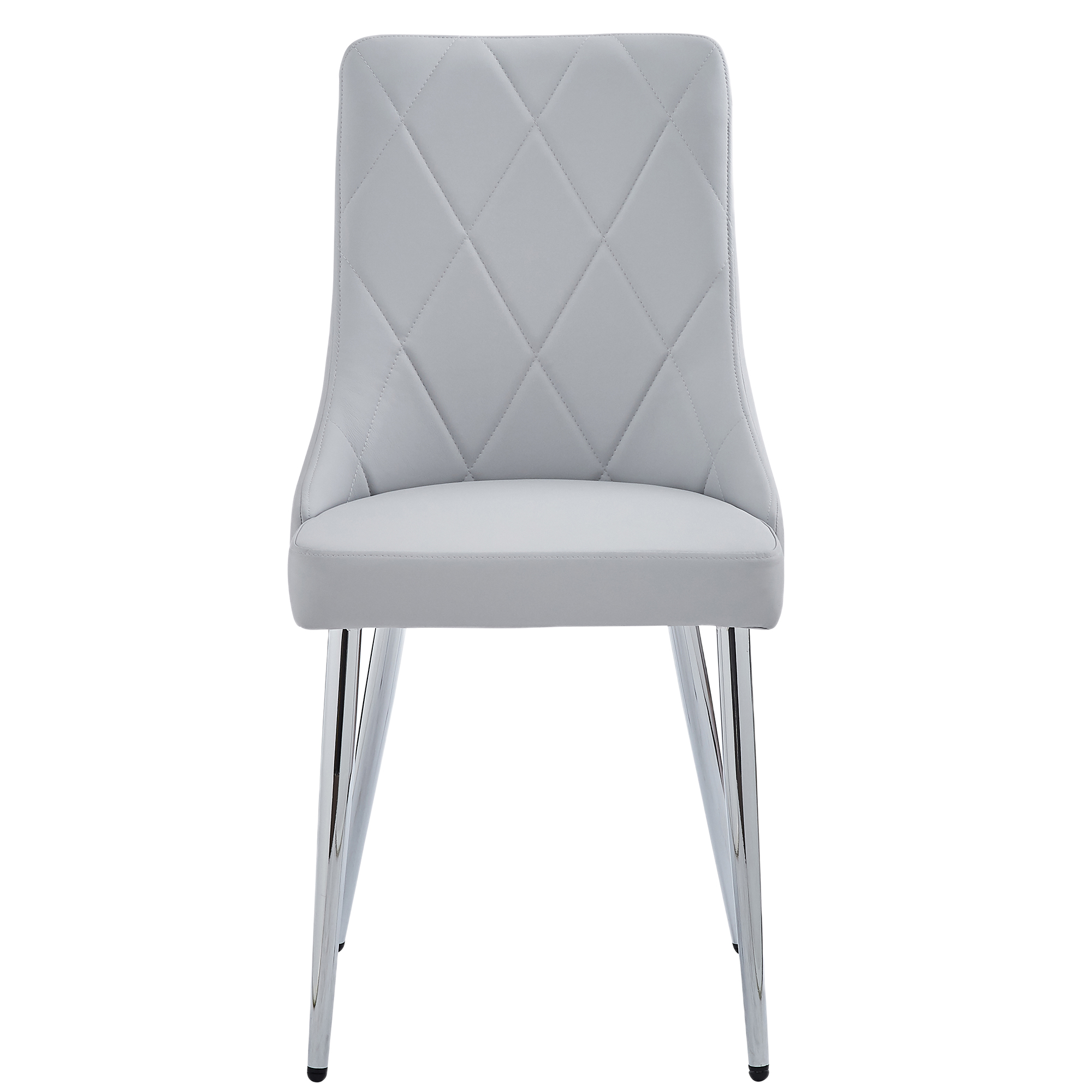 Contemporary beauty that is ideal for small spaces. The clear glass top and airy design create the impression of space. Chromed metal legs provide sturdy support. Great for casual dining. Composed of wood, faux leather, and metal, this side chair is a show stopper all its own. With its curved wood seat frame, seat cushion covered in faux leather upholstery with stitching details on the back, and chrome-finished metal legs, this chair unifies a multitude of elements all into one perfectly composed design. The comfortable seat allows for hours of conversation around the dinner table, while the slim, tapered look of the metal legs adds a splash of sophisticated design.