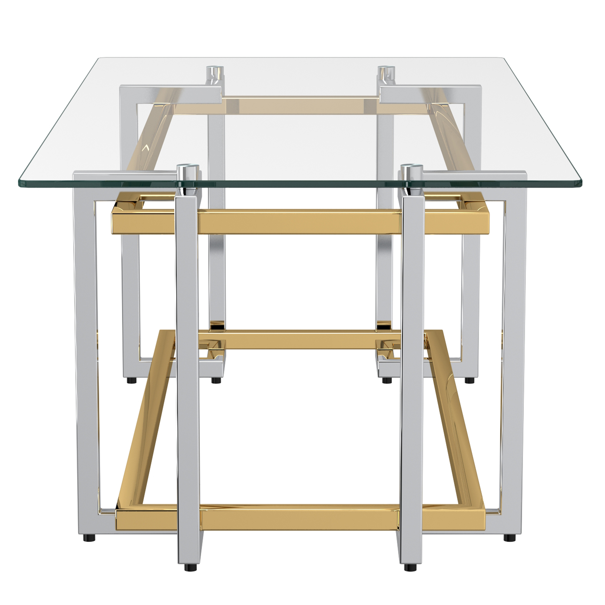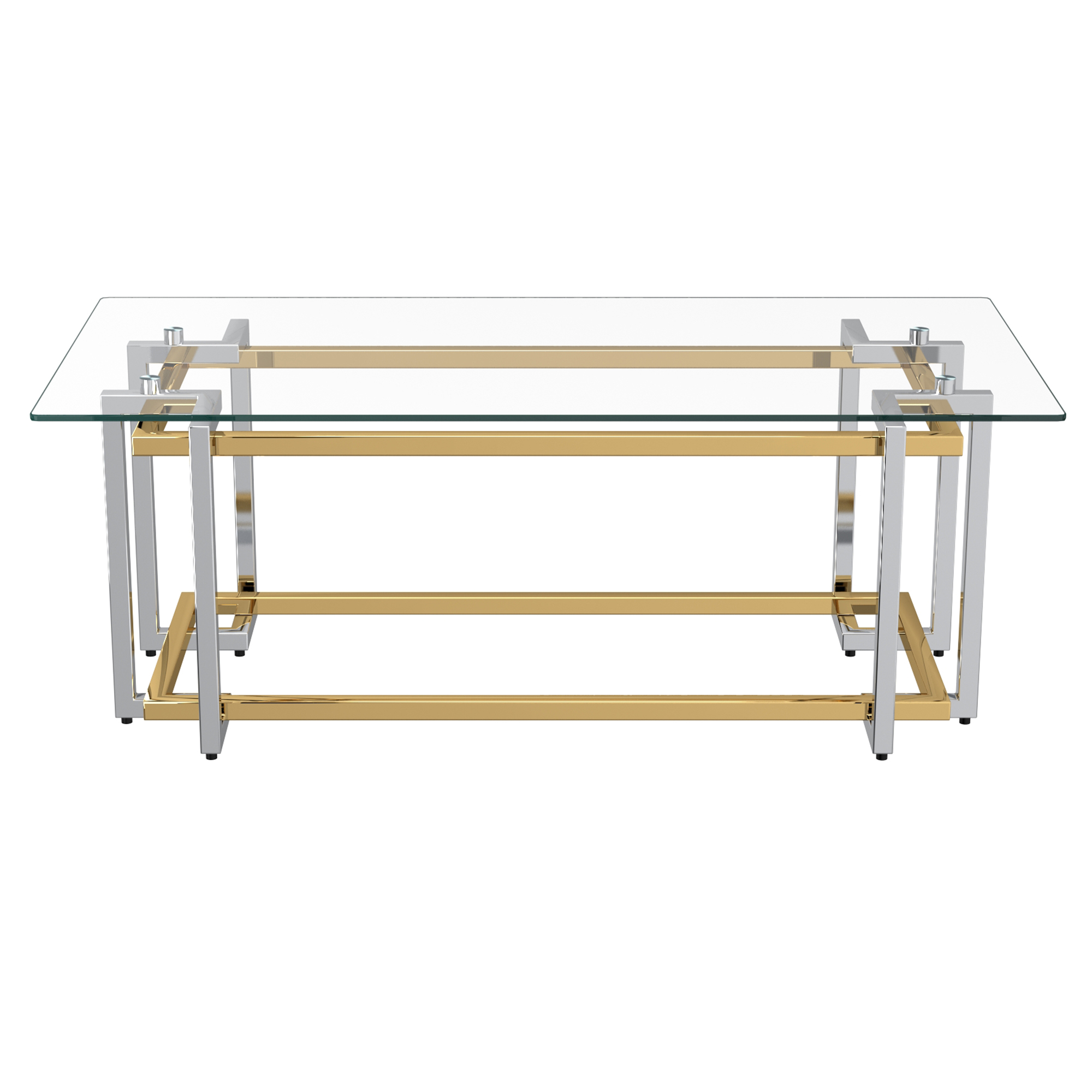 Stylish contemporary metal and glass coffee table with an interlaced gold and silver finish. The geometric design and the glass top gives this piece an airy look that will add beauty and function without being overbearing. Great in a formal or casual living space.