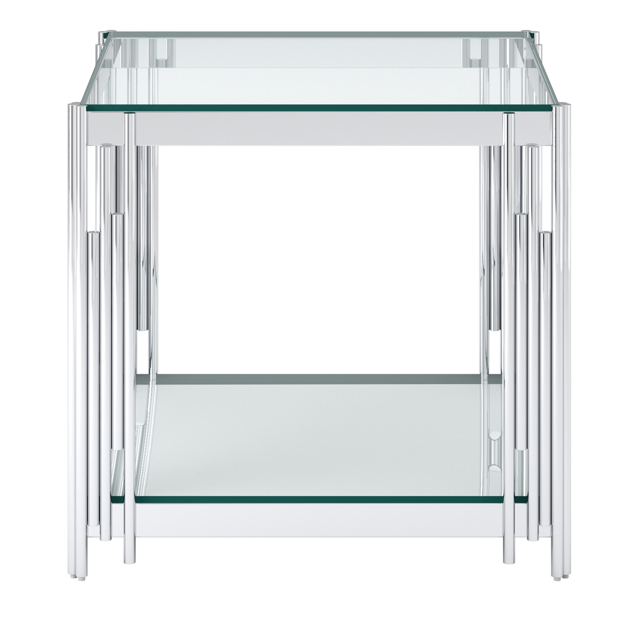 Contemporary table with some art-deco inspired style. The polished metal frame and two-tier glass and mirror design will bring instant shine to any room and provide space to store and display. Use in the living room or bedroom as a night table.