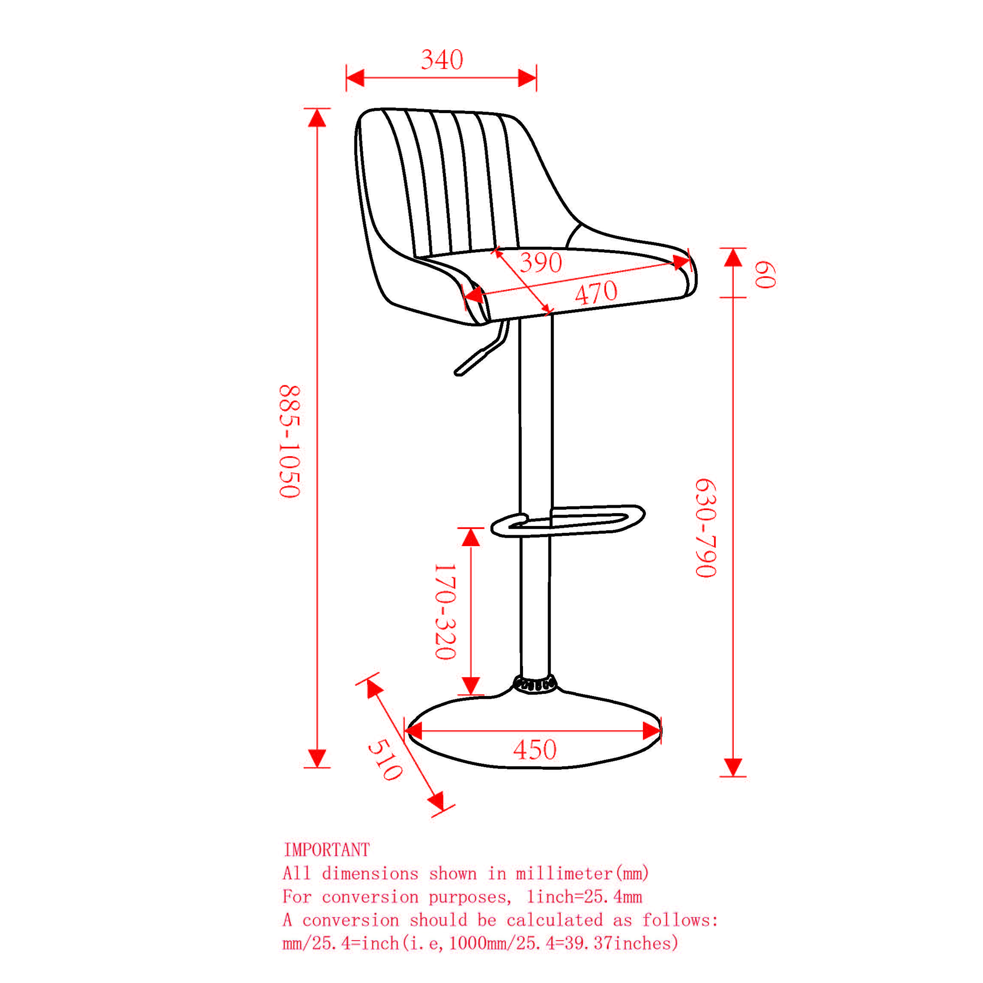 • Air-lift seat height adjustment ranges from 24.75" to 31.25"
