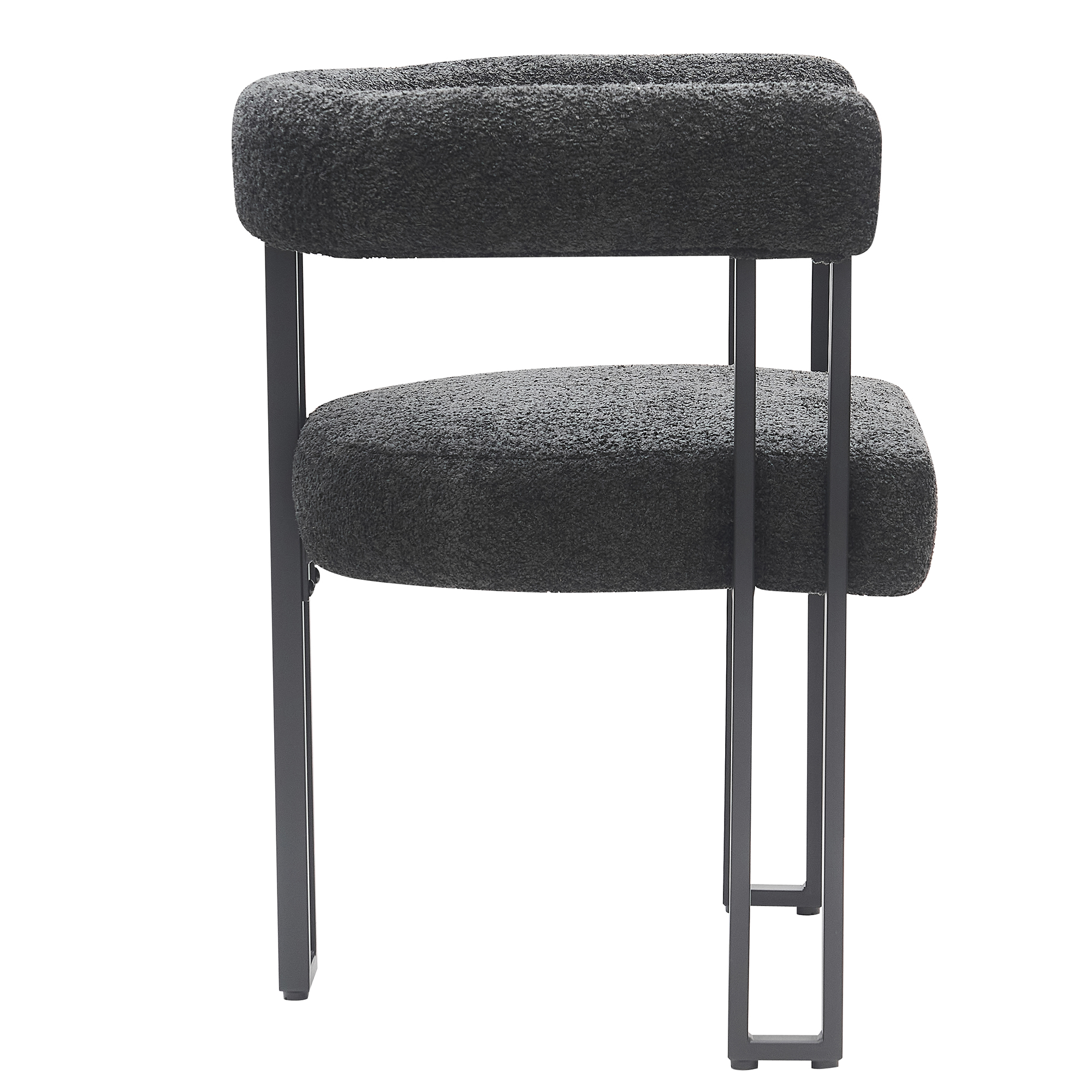 Bring the magazine-worthy dining experience to life with these beautiful, boucle-upholstered dining chairs. The textured fabric is quickly becoming a design staple for creating that high-end feel in your space. The square-line black metal frames and supports the chair perfectly, providing hours of seated comfort. Perfect for formal dining spaces, or kick up your everyday dining experience and pair with your casual kitchen table.