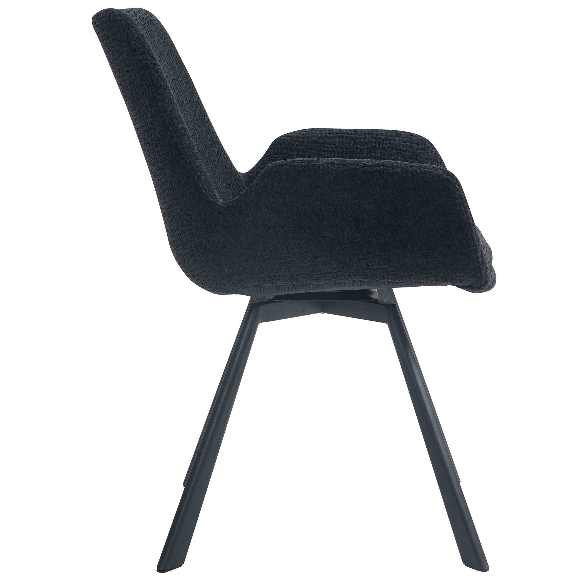 The textured chenille fabric of this dining chair will simply make you swoon…soft and comfortable, easy to wipe clean, and simply beautiful! Welded metal base provides sturdy support and the return swivel on the base will add a fun and unexpected element to your seated experience. The angled back, curved seat and arms add a formal touch to your space, but these chairs are just as well suited for casual dining spaces. Black metal legs allow for any easy match to a variety of table styles.