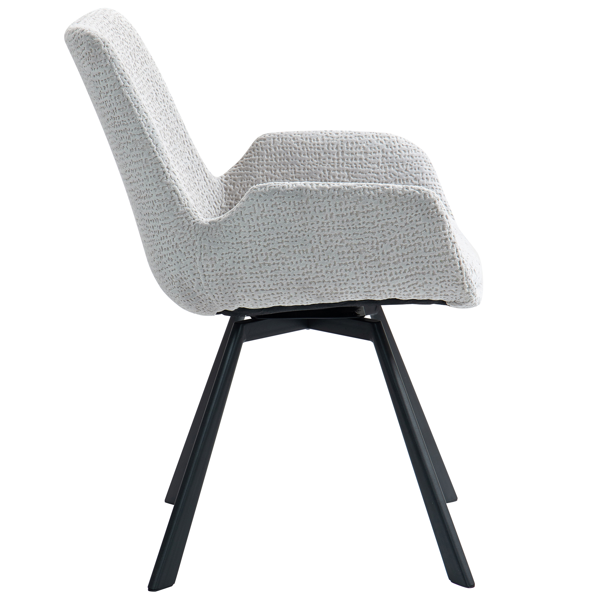 The textured chenille fabric of this dining chair will simply make you swoon…soft and comfortable, easy to wipe clean, and simply beautiful! Welded metal base provides sturdy support and the return swivel on the base will add a fun and unexpected element to your seated experience. The angled back, curved seat and arms add a formal touch to your space, but these chairs are just as well suited for casual dining spaces. Black metal legs allow for any easy match to a variety of table styles.