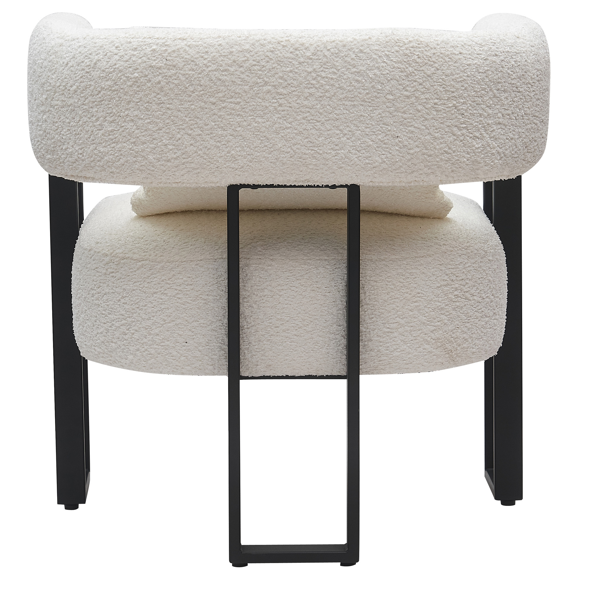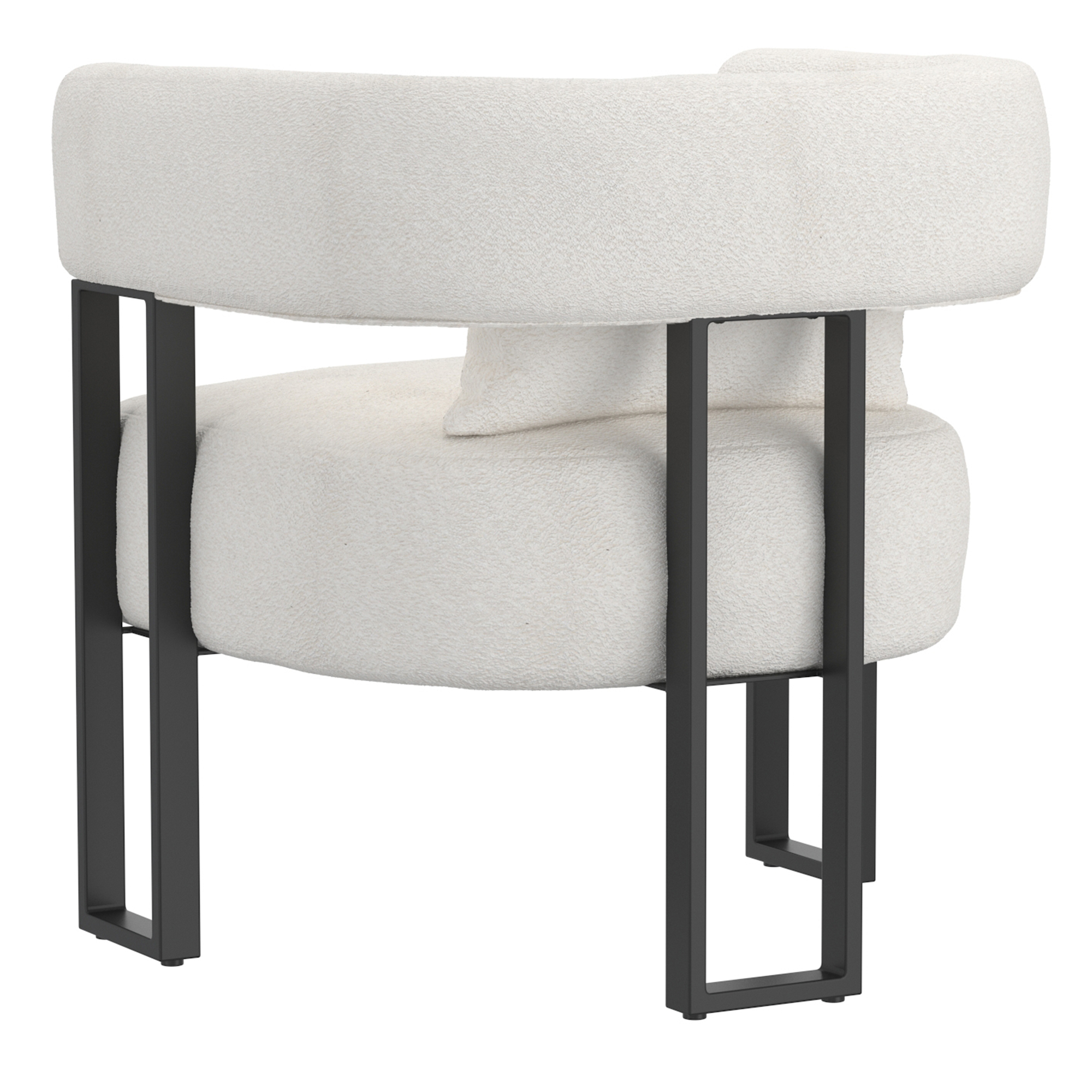Modern bucket-style accent is the epitome of high-end designer style. The textured boucle fabric and the squared, black metal frame work perfectly with the contoured seat back to create the perfect accent seating. Matching throw pillow provides lumbar support or gives opportunity for mixing and matching with other fabrics in the room. Create a cozy conversation space in a formal living room, or place in a bedroom for a perfect reading chair.
