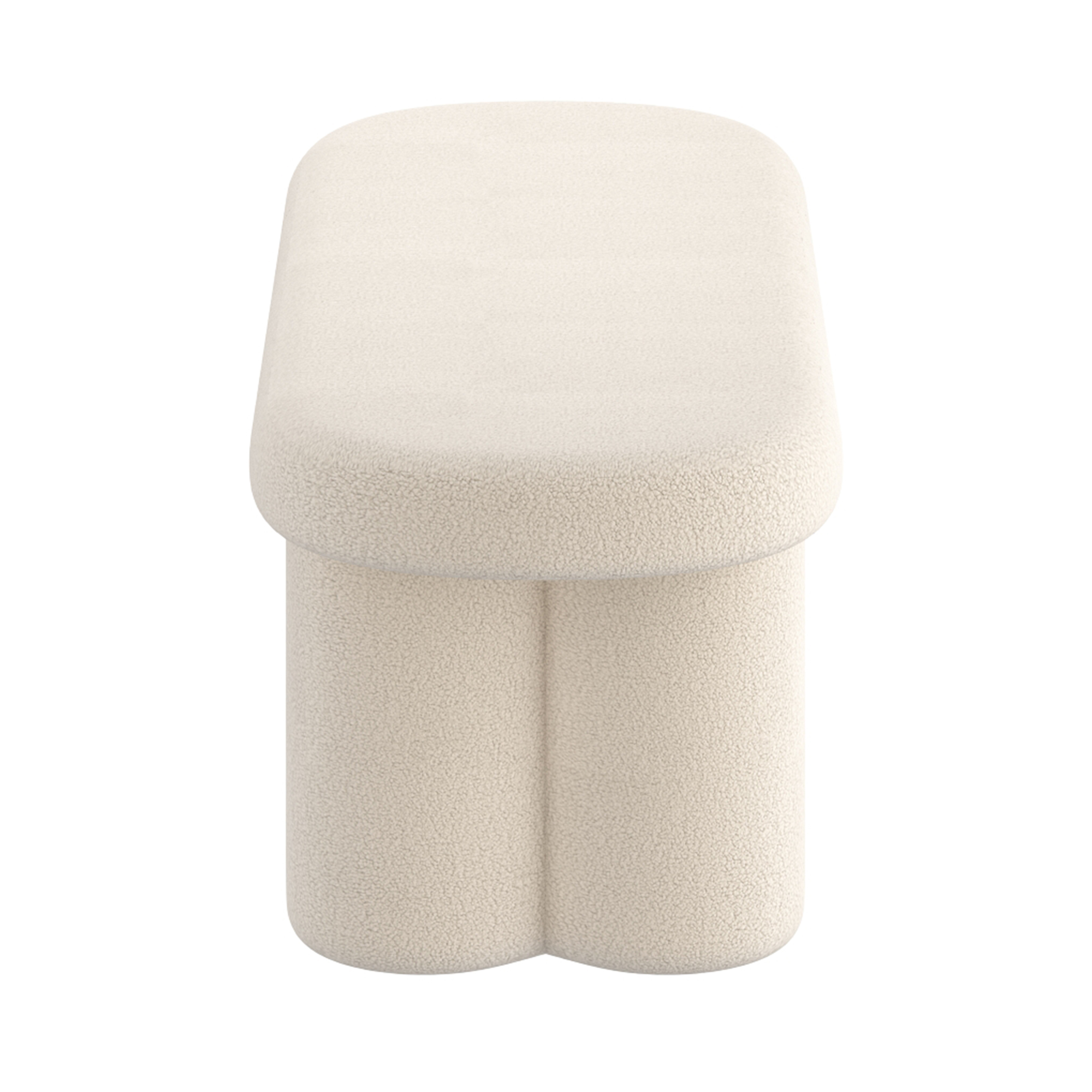 Cozy, modern, high end vibes are fully present with this beautiful, fully-upholstered bench. The stadium-shaped oval top sits regally on top of two double-pedestal column style legs, creating sturdy support. The soft boucle fabric is warm and inviting. A classic piece at the end of a bed, or a gorgeous statement maker in an entryway or hallway.