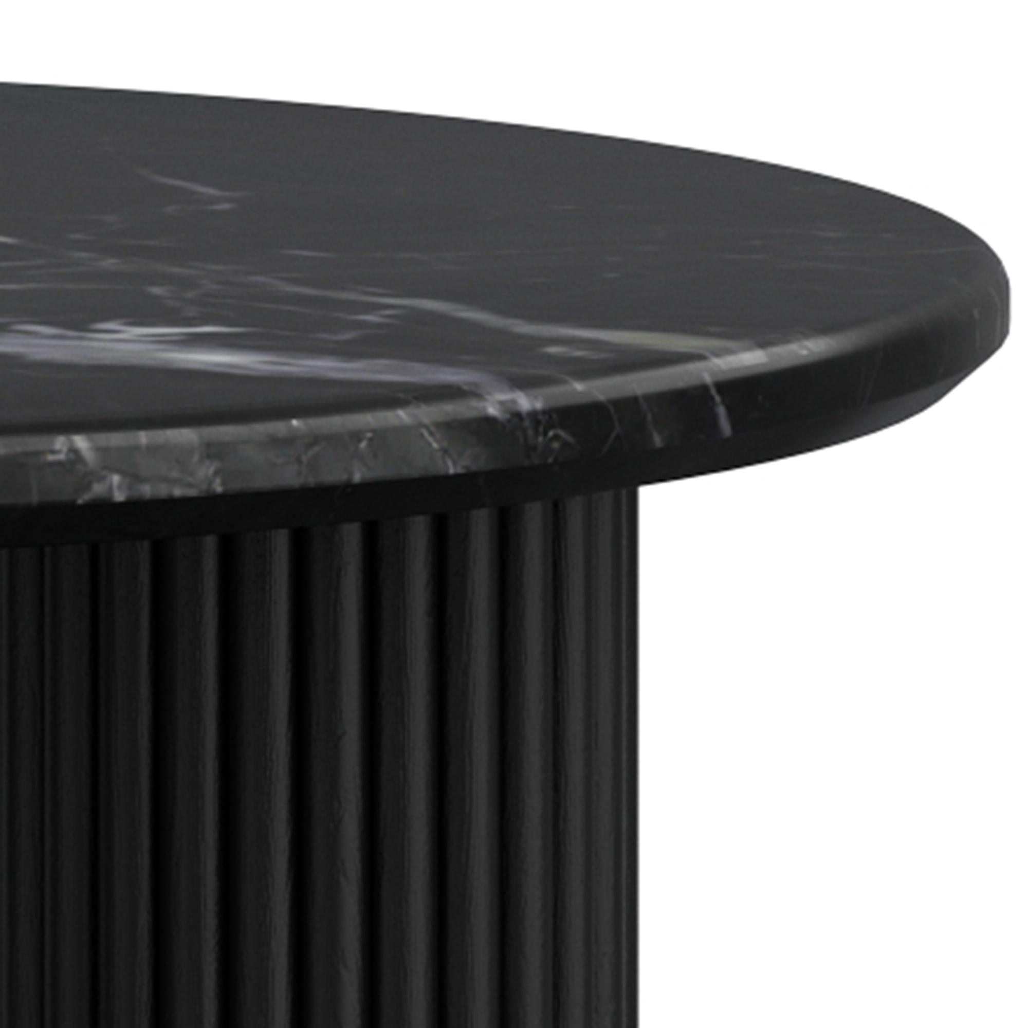 This gorgeous and sophisticated table is meticulously crafted from sustainably-sourced, solid mango wood, providing a rich and sturdy foundation. The reeded finish on the pedestal is perfectly topped with a thick, bevelled marble top creating a refined piece that will elevate your carefully designed space.