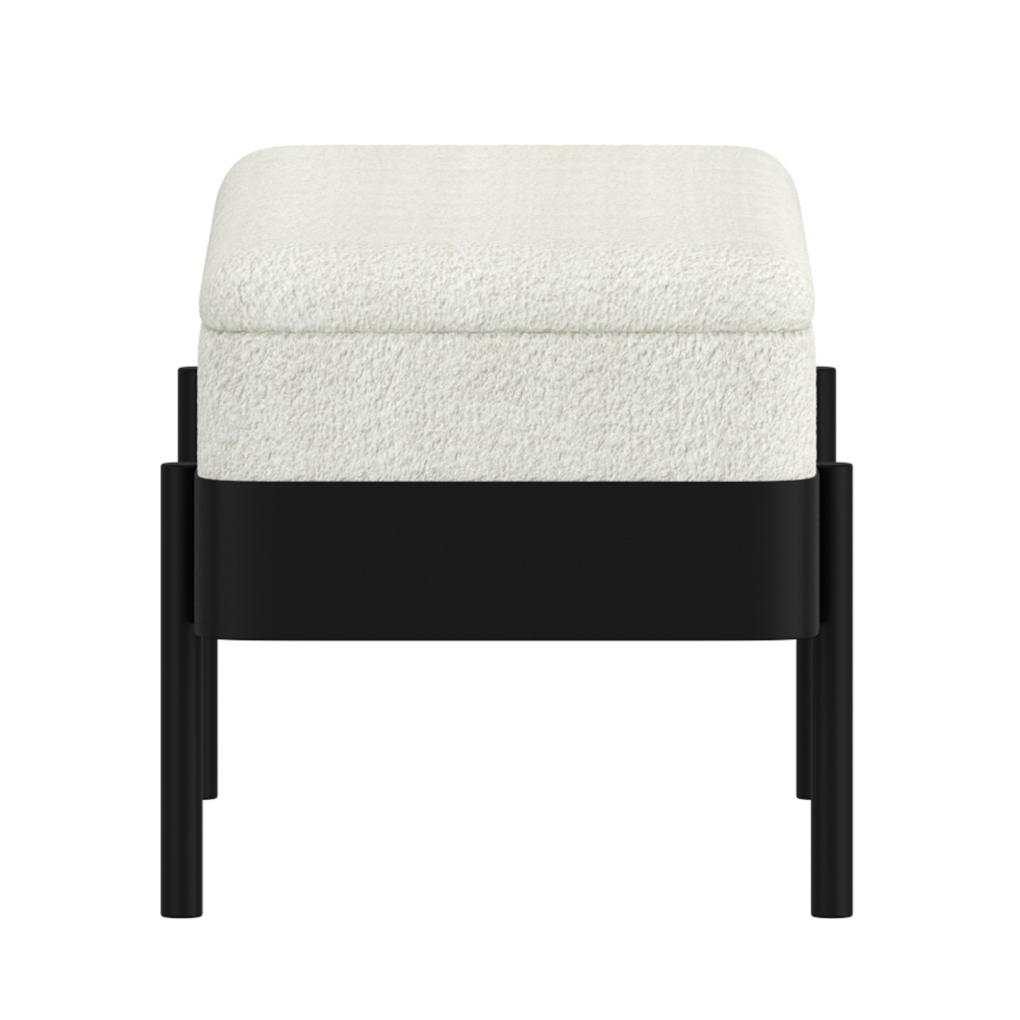 Add a touch of refined texture to your living space with this storage ottoman, a perfect blend of comfort and style. Upholstered in luxurious boucle fabric, the plush top invites you to sit or rest your feet in ultimate coziness. The ottoman's standout feature is the wrapped metal frame which adds a touch of modern craftsmanship. This piece is perfect as a bench for extra seating, or a stylish footrest that enhances any room and adds the convenient option of hidden storage.