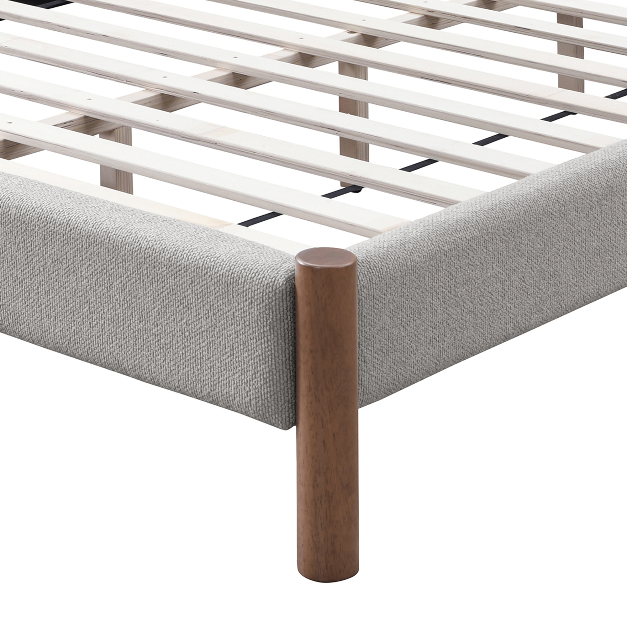 Mid-century style doing what it does best with this timeless bed. The solid wood posts are finished in a warm walnut. The two-toned mushroom colour of the texture fabric will work well with various décor themes and colours. Great for a primary bedroom or guest room, or at the cottage.