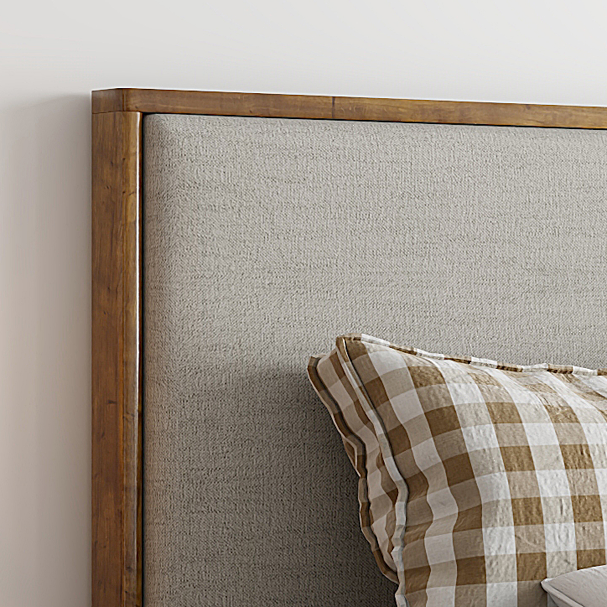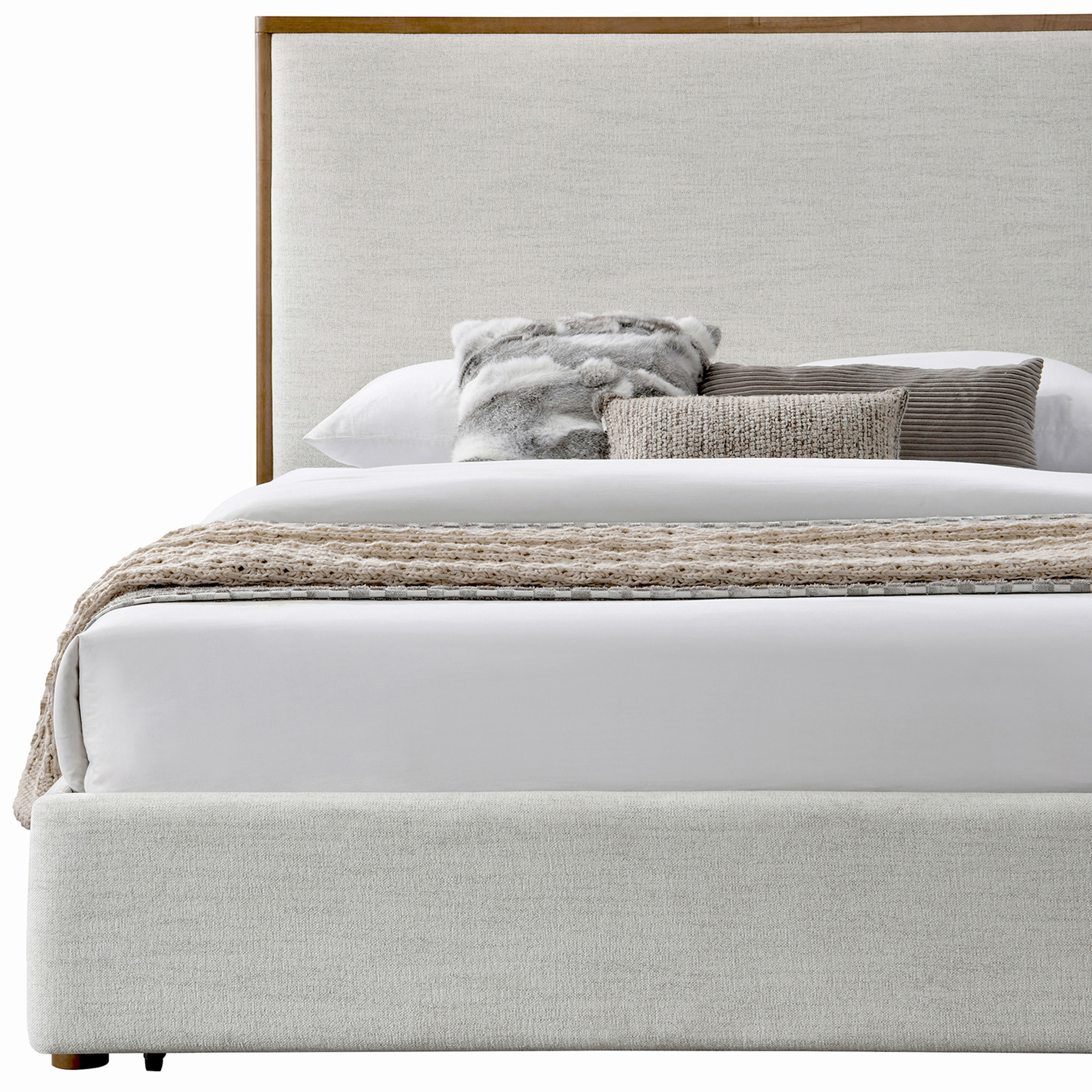 Majestic platform bed makes a statement with the high headboard. The plush upholstered headboard has a solid wood, walnut-finished surround, giving the piece an impeccable tailored look. The spacious wooden storage drawer in the footboard rolls out for easy access and is the perfect place to store extra bedding, cushions, or your prized shoe collection. Great for a primary bedroom or at the cottage.