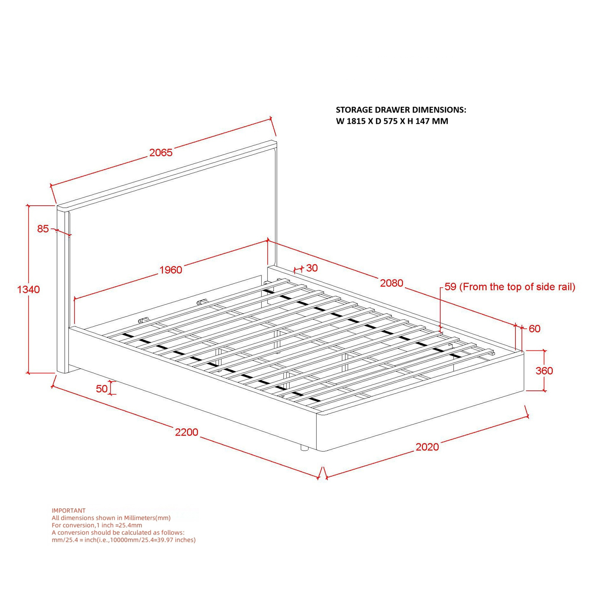 • Large capacity, roll-out wooden storage drawer on footboard