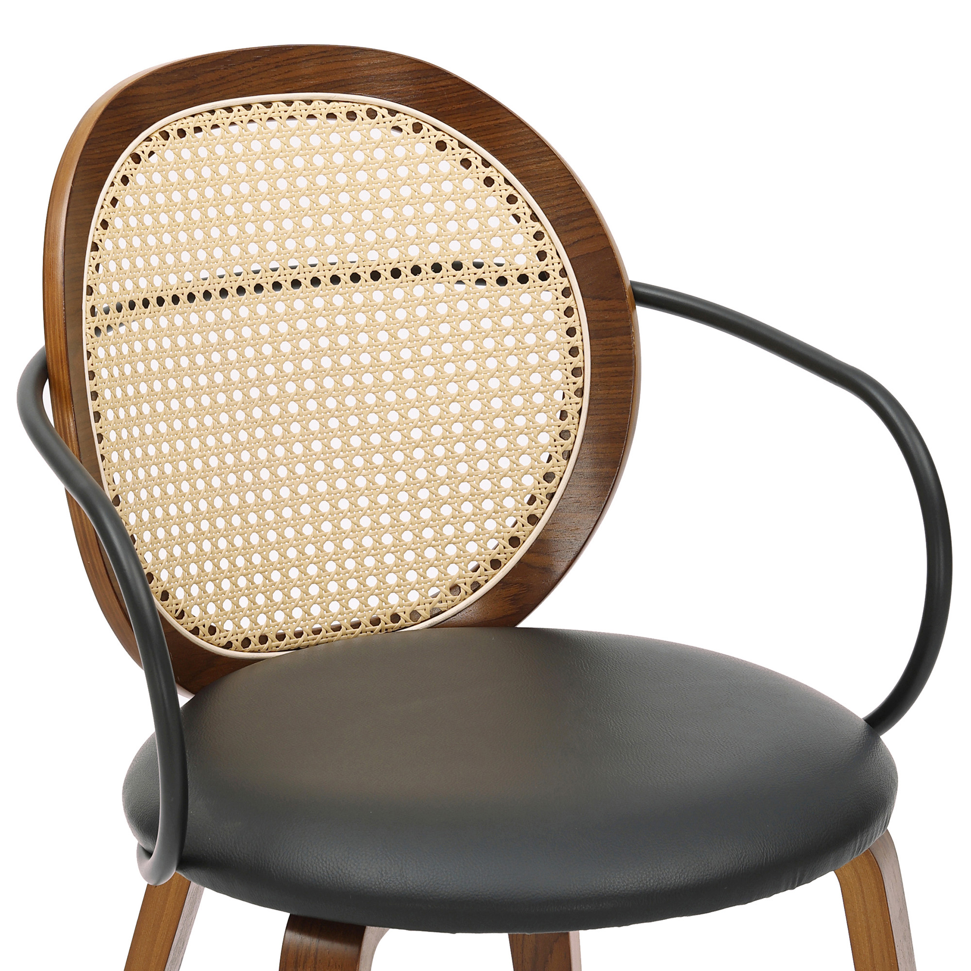 Bringing timeless elegance to the forefront with a modern twist. The faux rattan on the chair back creates a soft and inviting look while the black metal wrap-around arms and black faux leather seat give a more updated look to these chairs. The walnut finish of the bentwood frame and legs is the perfect finishing touch to tie it all together. Great for formal or casual dining spaces.