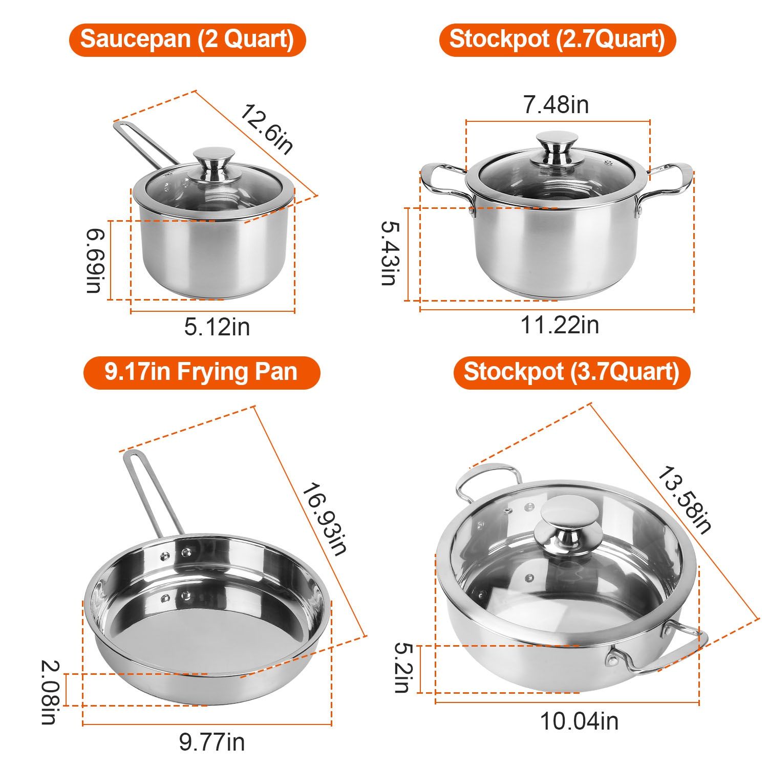 Stainless Steel Cookware Set Fast Even Heat Induction Pots Pans Set Dishwasher Safe with 2.7 3.7 Quart Stockpot 2 Quart Saucepan 9.17in Frying Pan